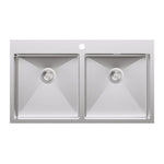 Kitchen sink, 10 in (H) × 19 in (W) × 32 in (L), premium dual bowl with brushed finish.
